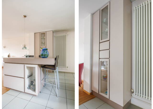 The spacious kitchen is equipped with various appliances including a 4-burner gas hob, an oven, an extractor hood, and a dishwasher. It also features a custom-made kitchen island with a raised seating area and additional cupboard space. A built-in high cupboard wall with display cabinets in the same style and color completes the kitchen. A matching cabinet wall is also found in the seating area, featuring another built-in display cabinet for a cohesive design.