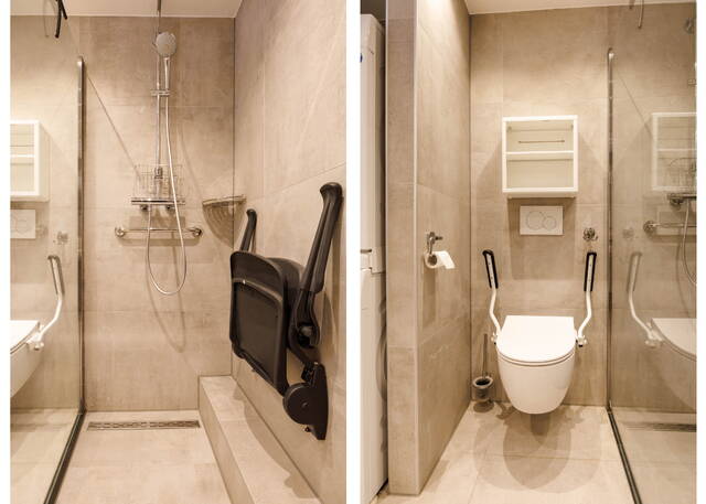A spacious landing with plenty of daylight thanks to a side window. At the front of the house is a large bedroom with air conditioning and a walk-in closet. At the rear are two spacious and bright rooms that can be used as bedrooms or home offices; one of them also features a washbasin. The modern and luxurious bathroom (2021) is spacious and includes a rain shower, toilet, towel radiator, and double sink vanity with mirror, two floating cabinets, built-in lighting, and mechanical ventilation. The bathroom also houses the washing machine and dryer.