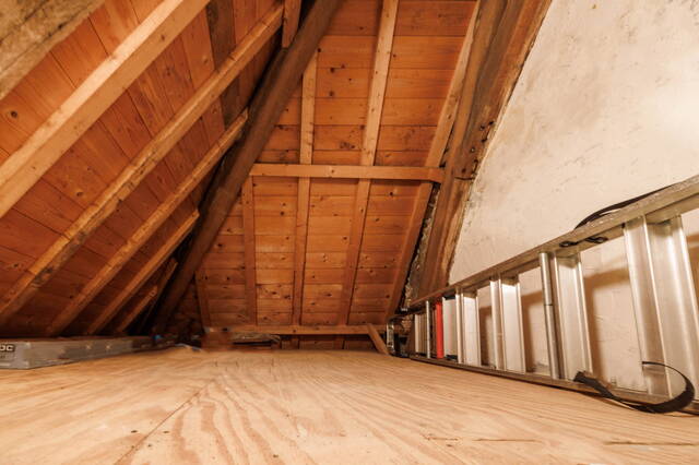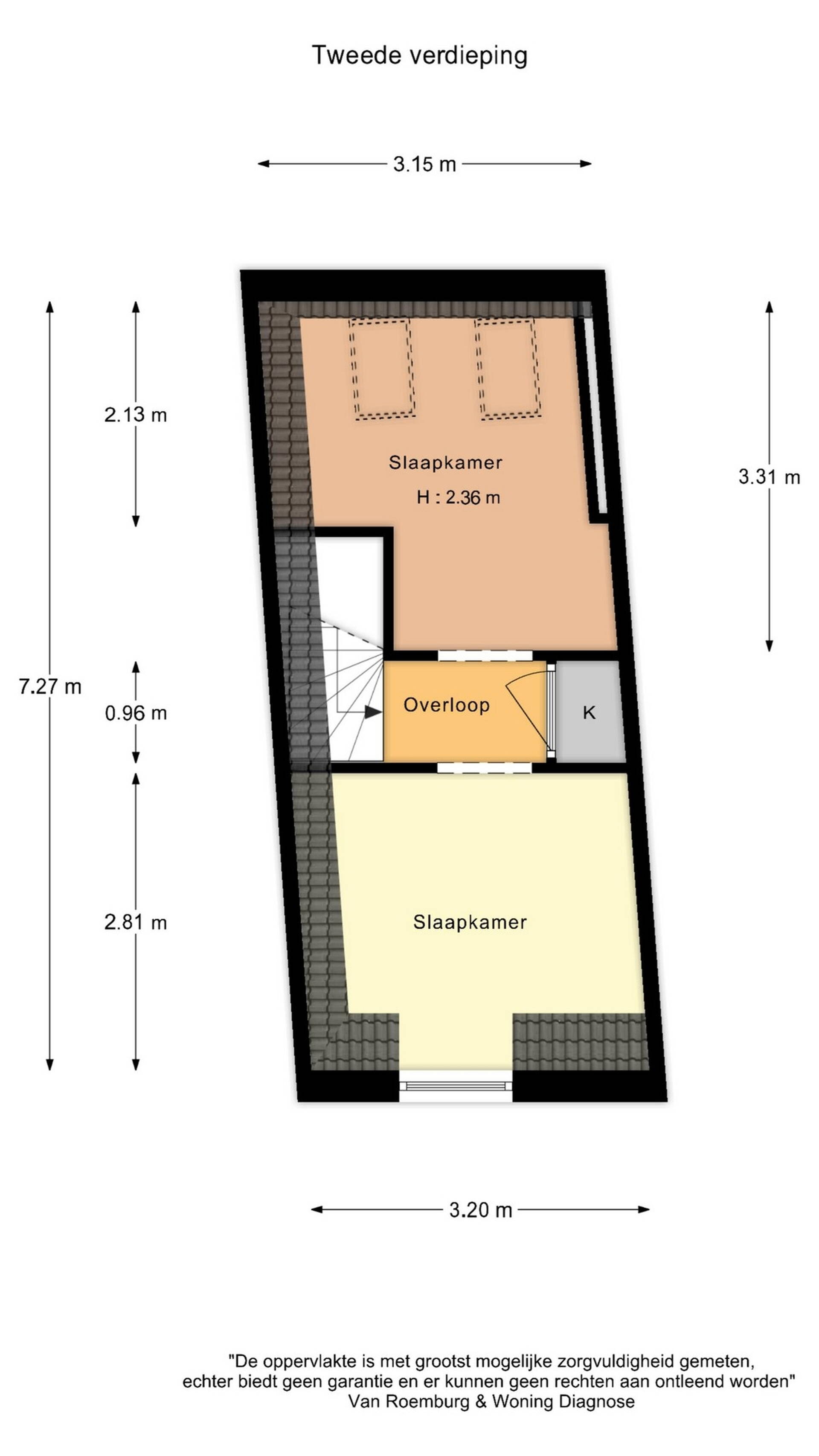 Landing with a large built-in wardrobe and access to two charming (bed)rooms. The sunny room at the front has a dormer window, and the cozy room at the back has two skylights. From the landing, a loft ladder provides access to the very spacious attic with lots of extra storage space.