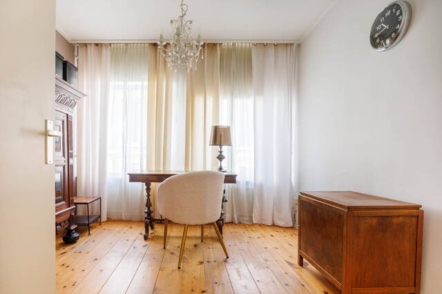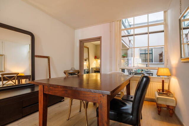 Entrance with direct access to the charming living room, which flows into the cozy kitchen-diner, situated where the courtyard used to be. Thanks to the high windows that remain between the kitchen and living room, this is now a lovely sitting area with lots of daylight. The charming kitchen includes a 4-burner gas stove, a built-in oven, and a (freestanding) microwave.