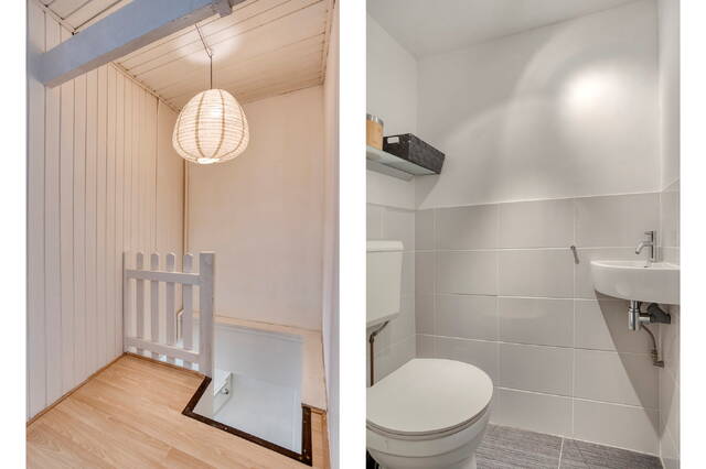 The spacious landing provides access to two bedrooms. The bedroom at the rear is generously sized and could potentially be divided into two rooms. The bedroom at the front comes with a built-in wardrobe. On the landing, you will also find a separate toilet with a small washbasin.