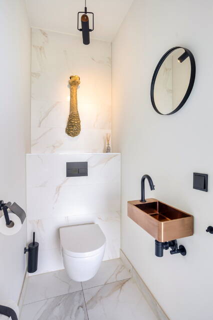 De entree biedt toegang tot een hal met modern toilet en een aparte technische ruimte met de boiler, verdeler voor de vloerverwarming en omvormer voor de zonnepanelen.