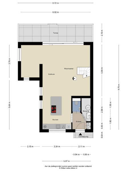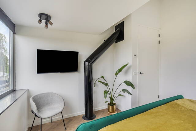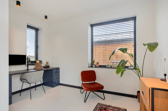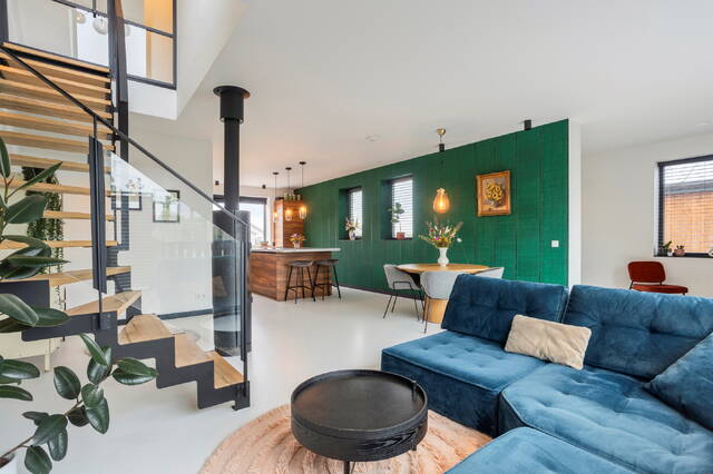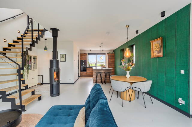 De woonkamer is verrassend ruim en licht, met een grote glazen schuifpui die het binnen- en buitenleven naadloos met elkaar verbindt. De ruimte is speels ingedeeld en biedt een apart gedeelte dat momenteel in gebruik is als kantoor of werkruimte, ideaal voor thuiswerken of als leeshoek. Hier bestaat tevens de mogelijkheid om eenvoudig een derde slaapkamer te creëren. Achterin bevindt zich het tuingerichte zitgedeelte, waar in alle rust van het uitzicht over de tuin, het groen en het water kan worden genoten. Dit gedeelte staat in open verbinding met de rest van de woonkamer en de sfeervolle draaibare houtkachel, die vanuit verschillende hoeken van de kamer te bewonderen is en zorgt voor een warme, uitnodigende sfeer. De stalen trap met frakéhouten treden sluit hier prachtig op aan en vormt een stijlvolle eyecatcher in het interieur.