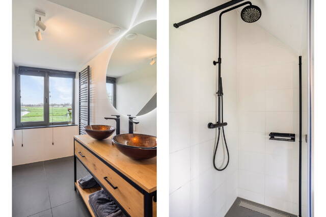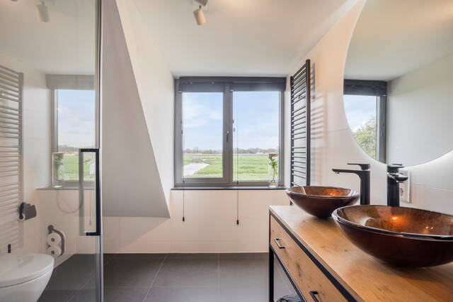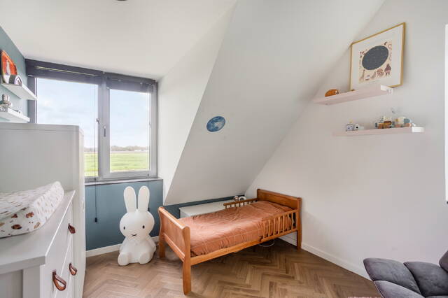 Op de eerste verdieping bevinden zich twee ruime slaapkamers, beide voorzien van dakkapellen aan de voor- en achterzijde, waardoor de kamers veel licht en ruimte bieden. Vanuit elke kamer is er een prachtig uitzicht over het water, de weilanden en het groen rondom de woning, wat bijdraagt aan een gevoel van rust en verbondenheid met de natuur.. De moderne badkamer is voorzien van een inloopdouche, wastafelmeubel en toilet terwijl op de overloop een separate wasruimte aanwezig is.