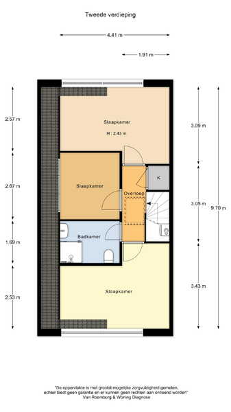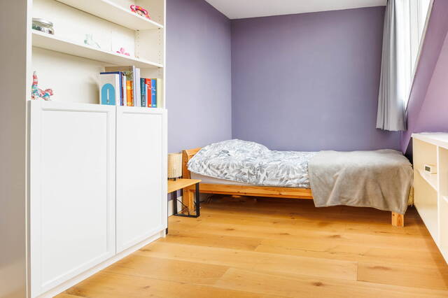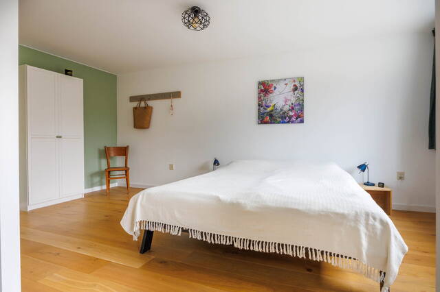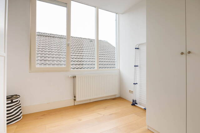 De overloop brengt de 2 ruime slaapkamers (voorheen 3 slaapkamers) samen. De doorgebroken slaapkamer wordt nu gebruikt als walk-in closet. De badkamer heeft een ligbad, wastafel, 2e toilet, wasmachine/drogeraansluiting en mechanische ventilatie. Ook biedt deze veel opbergruimte. De gehele etage is voorzien van eikenhouten lamelparket en heeft een sfeervolle en lichte uitstraling.