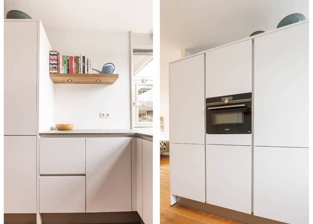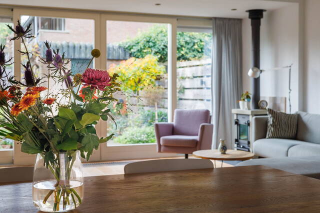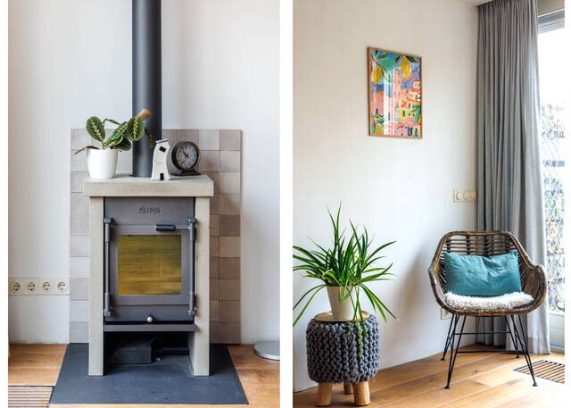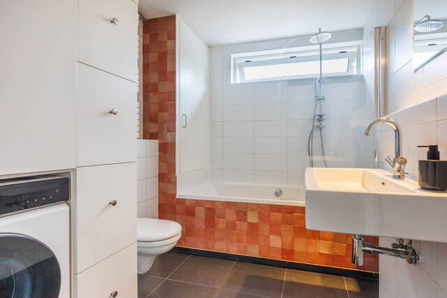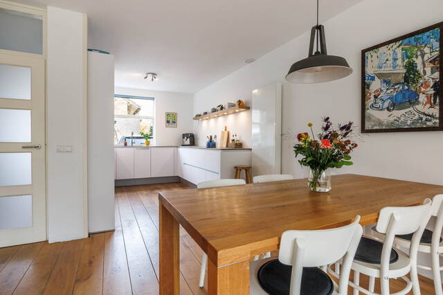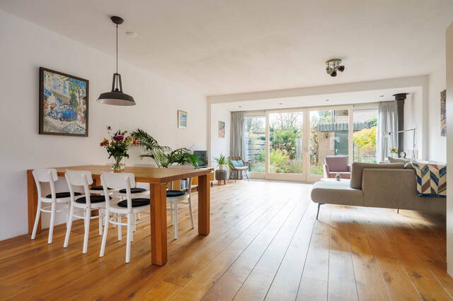 Entrance into a spacious hallway with a toilet and sink, and access to the beautiful extended living room. The floor is finished with solid oak parquet. For both warmth and atmosphere, there is a soapstone wood-burning stove that heats the entire space efficiently. The extension features large sliding doors to the south-facing garden, allowing plenty of natural light to fill the room. The generous and modern kitchen is equipped with a Dekton worktop and various built-in appliances, including an induction hob with integrated extractor, a combination steam oven/microwave, a dishwasher, and a fridge-freezer.