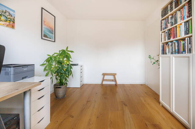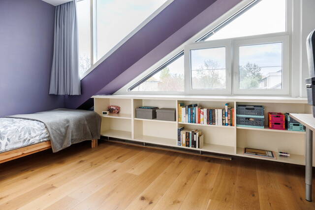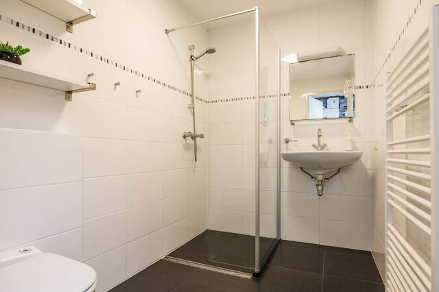 A spacious landing with central heating system, skylight, and access to three rooms and the second large bathroom. This floor features a full-width dormer extension. Both the front and rear rooms are fitted with built-in wardrobes that also serve as radiator covers. The bathroom includes a walk-in shower, washbasin, and third toilet. The same oak engineered parquet continues throughout this floor.