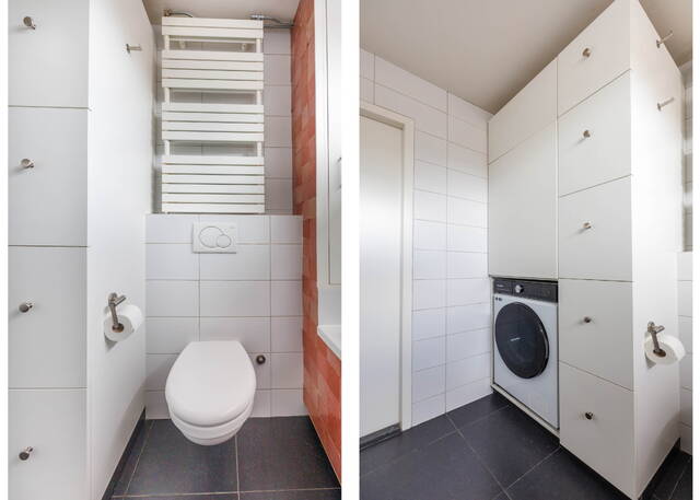 The landing connects two spacious bedrooms (previously three). The combined room is currently used as a walk-in closet. The bathroom features a bathtub, washbasin, second toilet, washer/dryer connection, mechanical ventilation, and generous storage space. The entire floor is finished with oak engineered parquet, giving it a warm and light ambiance.