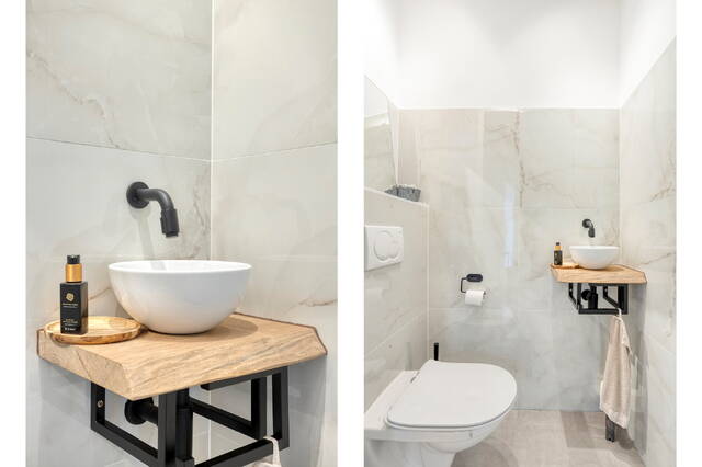 Three bedrooms, including a master bedroom. One of the bedrooms is currently used as a workspace and offers access to the roof terrace. The modern bathroom is fitted with a walk-in shower, double washbasin, bidet, and toilet.