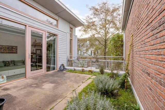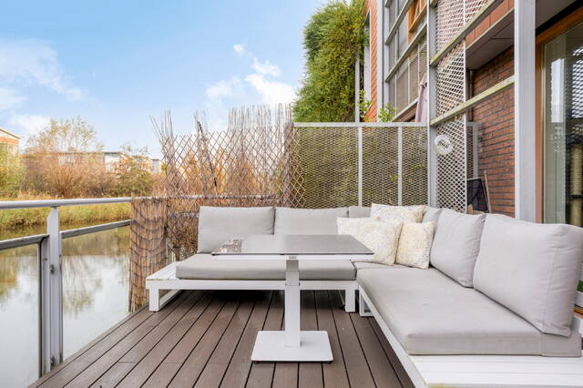 Entrance with hallway and access to the modern toilet and internal storage room. The sunny and atmospheric living room is situated around an inner garden (the patio), which provides plenty of natural light. Modern open kitchen equipped with various built-in appliances including a dishwasher, induction hob, extractor hood, oven, and microwave. In addition, there is a separate fridge with freezer. From the living room, there is access to the well-maintained terrace by the water.