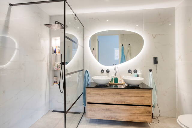 Drie slaapkamers, waaronder een master bedroom. Eén van de slaapkamers wordt momenteel gebruikt als werkruimte en biedt toegang tot het dakterras. De moderne badkamer is uitgerust met een inloopdouche, dubbele wastafel, bidet en toilet.
