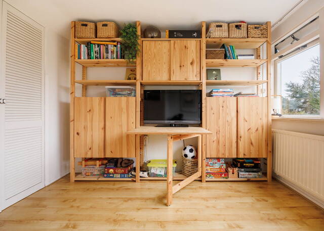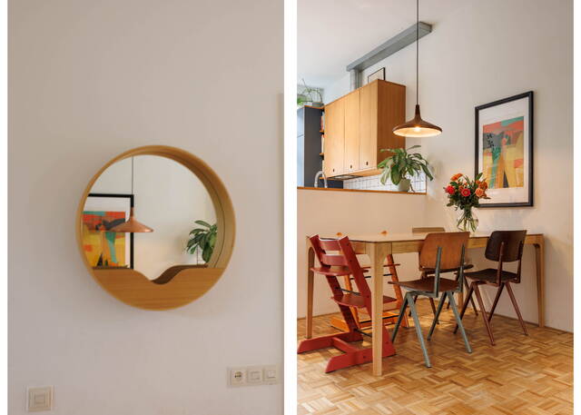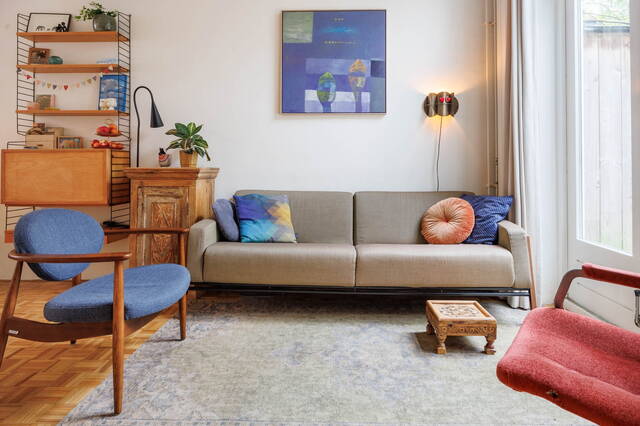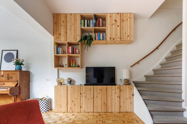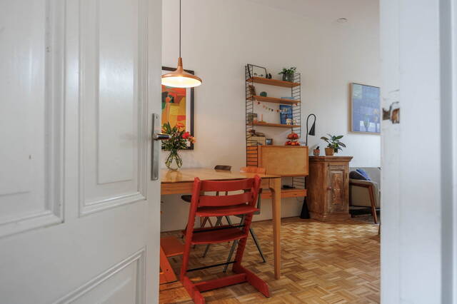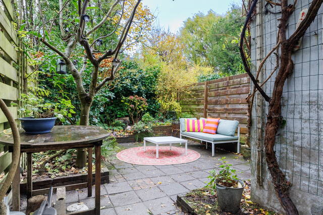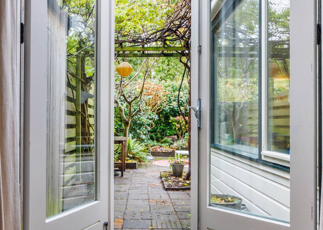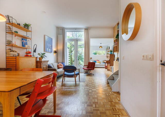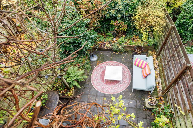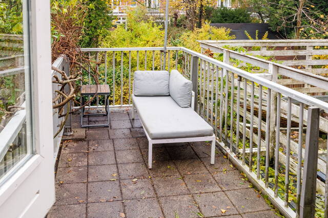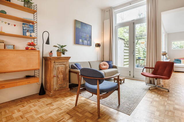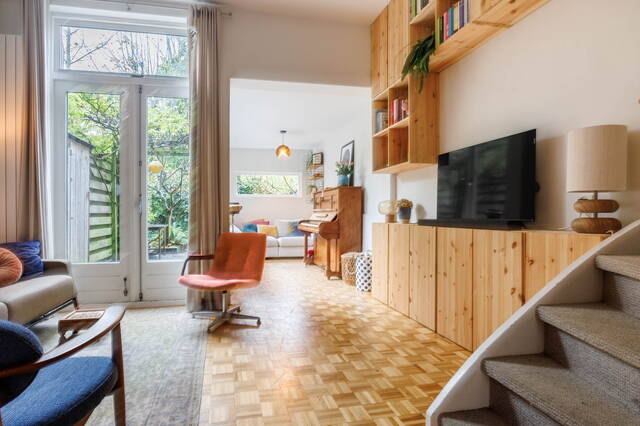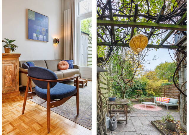 From the living room, French doors lead to the L-shaped backyard. This lovely garden (NW-facing) offers ample space for both dining and lounging areas. The lush planting includes a large fig tree, grapevines growing over the pergola, and wisteria. Thanks to the many trees on adjacent plots, this is a sheltered spot with plenty of shade in summer. It is a green and atmospheric urban garden that offers plenty of privacy.