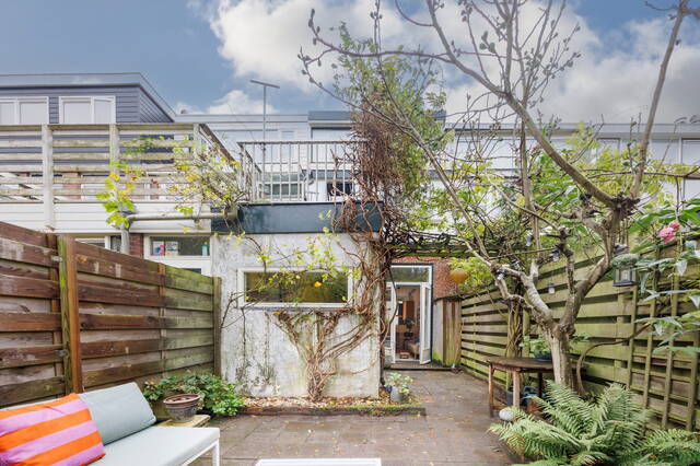 Vanuit de woonkamer bereik je via openslaande deuren de L-vormige achtertuin. Deze heerlijke tuin (NW) biedt volop ruimte voor zowel een eet- als een loungegedeelte. De weelderige beplanting bestaat onder meer uit een grote vijgenboom, druifranken die over de pergola groeien en een blauwe regen. Door de vele bomen op aangrenzende percelen is dit ook in de zomer een fijne, beschutte plek met voldoende schaduw. Het is een groene, sfeervolle stadstuin die veel privacy biedt.