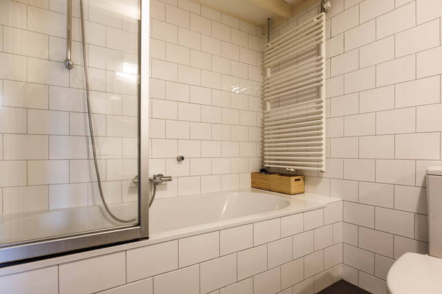 De verrassend ruime en moderne badkamer is fraai betegeld en voorzien van een wastafelmeubel, toilet, ligbad met douche en glazen wand, wasmachineaansluiting en mechanische ventilatie. De gehele verdieping is voorzien van een mooie laminaatvloer.