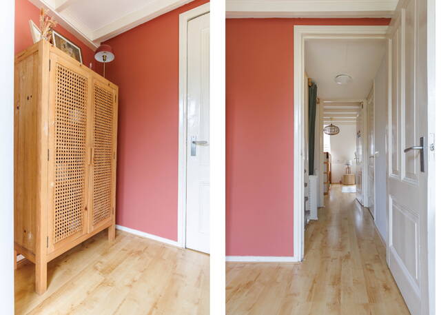 Via een vaste trap bereik je de overloop met ruime bergkast. Aan de achterzijde bevindt zich een ruime, lichte slaapkamer met elektrisch zonnescreen aan de buitenzijde en toegang tot een royale kast + bergruimte waar de CV ketel opstelling bevindt. Ook deze woonlaag is voorzien van een mooie laminaatvloer.