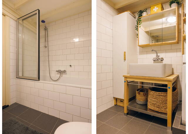 The surprisingly spacious and modern bathroom is beautifully tiled and equipped with a vanity unit, toilet, bathtub with shower and glass screen, washing machine connection, and mechanical ventilation. The entire floor has a stylish laminate finish.