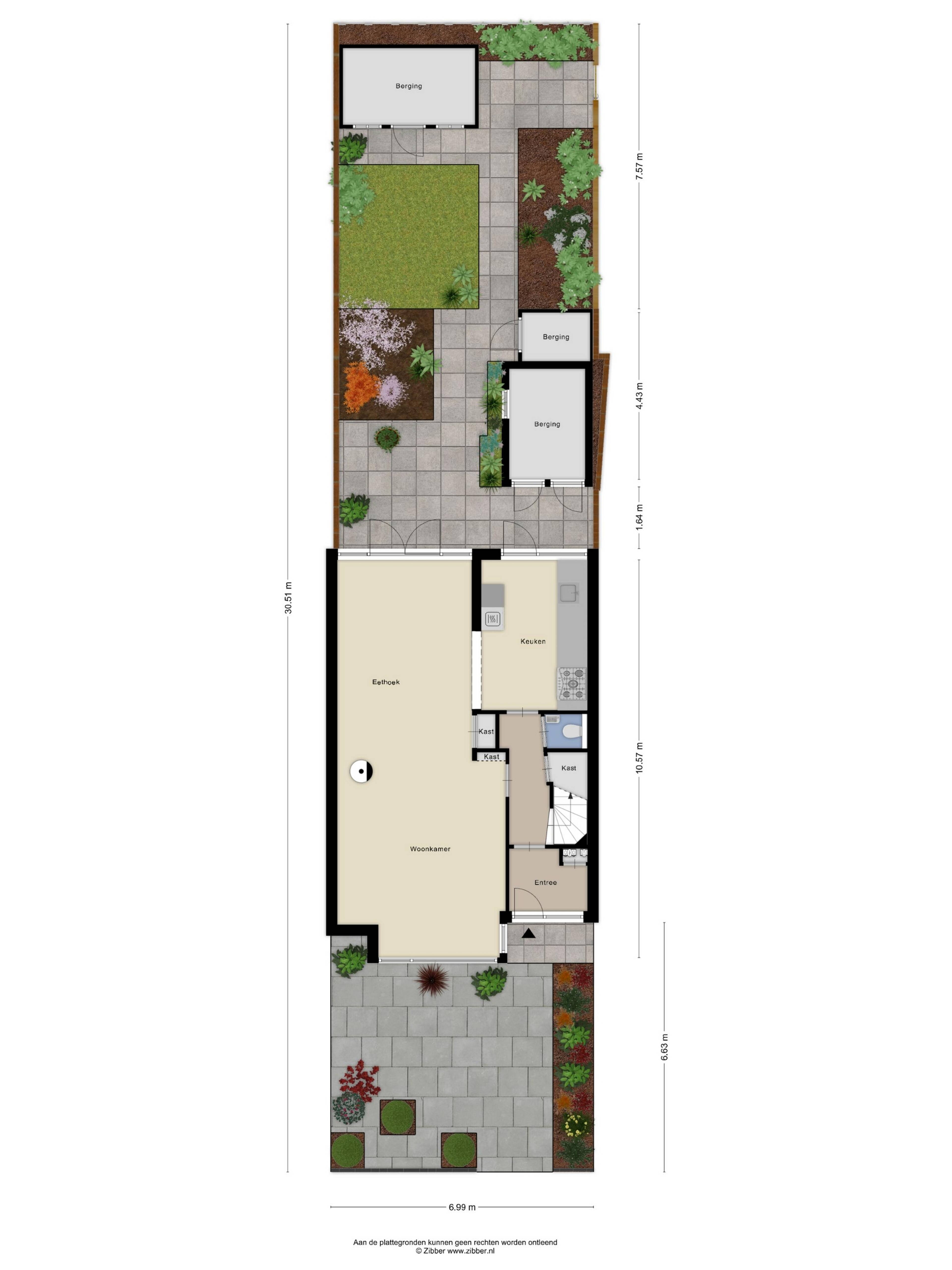 Sfeervolle voortuin en een fraaie entree. Via de vestibule met meterkast kom je in de hal, die toegang biedt tot de woonkamer, het moderne toilet met fonteintje, de keuken, de trapkast en de trap naar de eerste verdieping. De lichte, uitgebouwde woonkamer is voorzien van een stijlvolle gashaard en een vaste kast. Door de openslaande deuren stap je zo de prachtig zonnige achtertuin (Z/W) in, met een ruim terras direct grenzend aan de woonkamer. In de tuin bevinden zich een stenen berging met aansluitende houten opbergruimte en achterin nog een extra houten tuinhuis - meer dan genoeg plek voor onder andere fietsen. Dankzij de grote raampartijen aan zowel de voor- als achterzijde geniet de woonkamer de hele dag door van veel lichtinval en een mooi uitzicht op de tuin. In het voorjaar, de zomer en het najaar kijk je hier uit op een zee van groen, waardoor het voelt alsof je in een park woont.