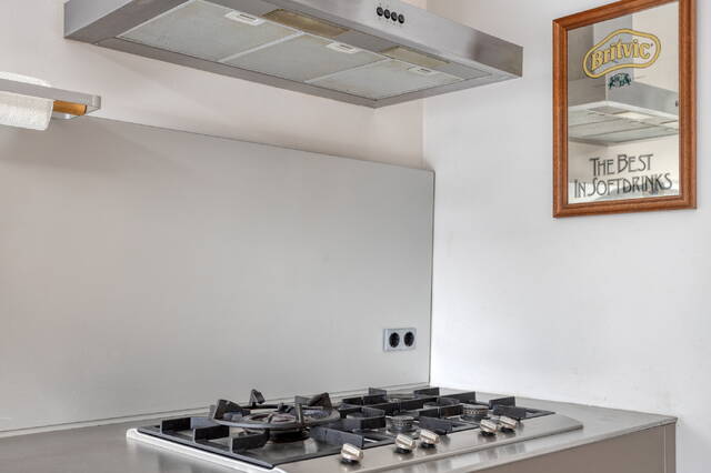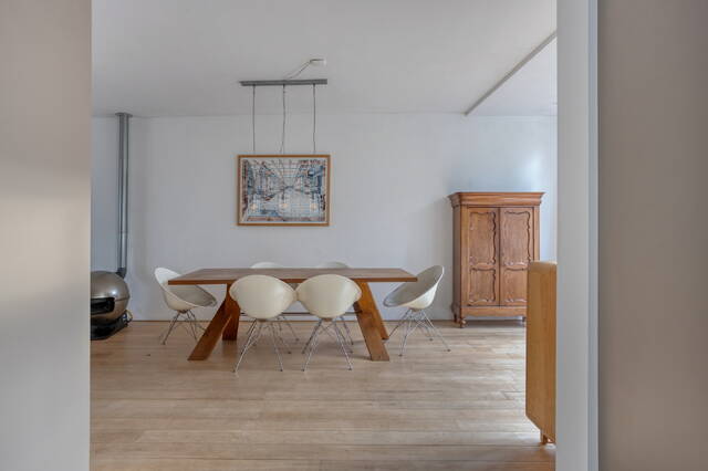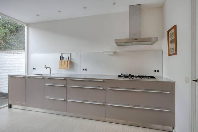 De zeer luxe halfopen Bulthaup-keuken is uitgerust met diverse inbouwapparatuur, waaronder een close-in boiler, 5-pits gasfornuis, vaatwasser, stoomoven, combi-oven/magnetron, grote koel-vriescombinatie en een afzuigkap. Het geheel wordt afgewerkt met een prachtig roestvrijstalen werkblad. Dankzij de grote ramen tot aan de vloer is dit een bijzonder lichte en prettige ruimte.