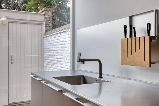The very luxurious semi-open Bulthaup kitchen is equipped with various built-in appliances, including a close-in boiler, five-burner gas hob, dishwasher, steam oven, combination oven/microwave, large fridge-freezer, and extractor hood. The kitchen is finished with a beautiful stainless steel worktop. Floor-to-ceiling windows make this an exceptionally bright and pleasant space.