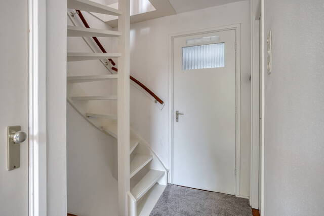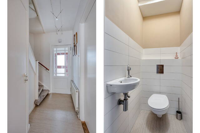 Attractive front garden and a stylish entrance. Through the vestibule with meter cupboard you enter the hallway, which provides access to the living room, the modern toilet with washbasin, the kitchen, a storage cupboard under the stairs, and the staircase to the first floor.
