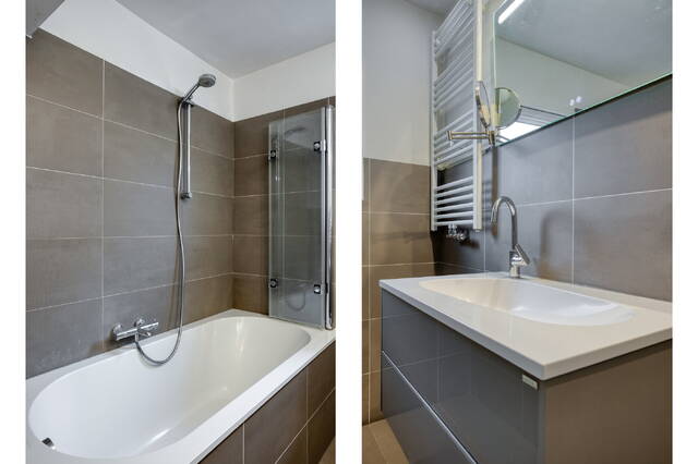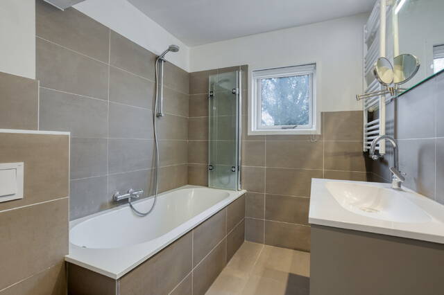 Landing with access to three bedrooms, the luxury bathroom, and a built-in cupboard. The spacious front bedroom has its own balcony. The two rear bedrooms both provide access to the large balcony, offering a lovely view over the rear garden. The modern bathroom is fitted with a bathtub/shower, vanity unit with illuminated and heated mirror, and a toilet.
