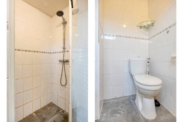 Aan de achterzijde bevindt zich de keuken, die in directe verbinding staat met de tuin. Aansluitend ligt de badkamer, voorzien van douche, wastafel en toilet.