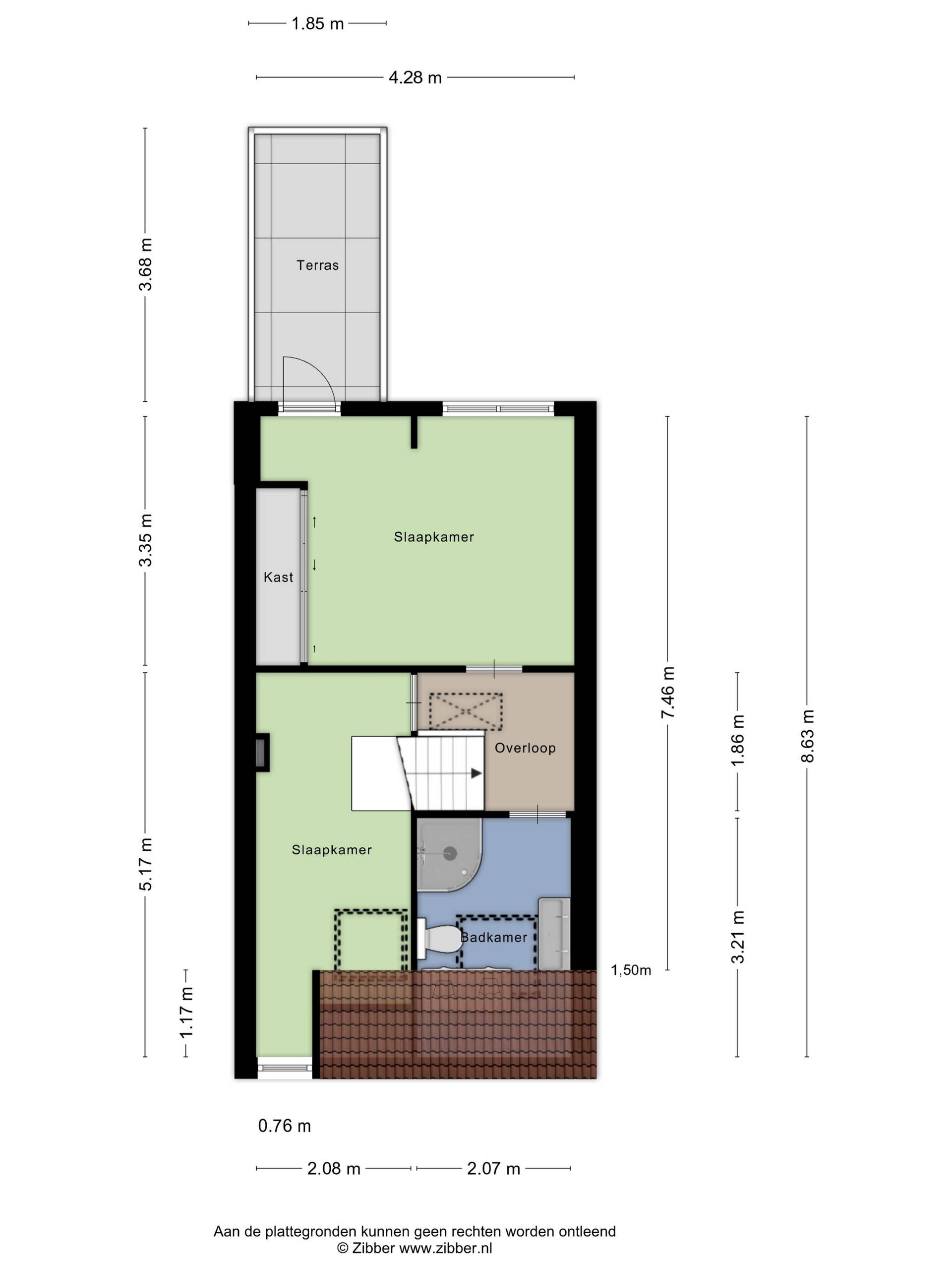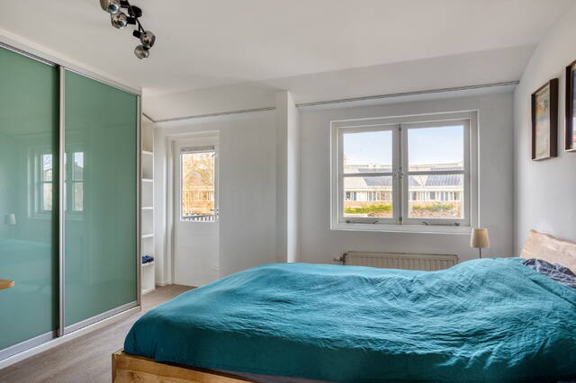Vanaf de trap bereikt je de overloop, die toegang biedt tot alle kamers op deze verdieping. Aan de achterzijde bevindt zich de ruime hoofdslaapkamer. Dankzij de recht opgetrokken achtergevel is er een opvallend royale ruimte ontstaan, die net dat extra beetje comfort en ruimte biedt. De slaapkamer is voorzien van een praktische inbouwkast en biedt bovendien directe toegang tot het zonnige dakterras.