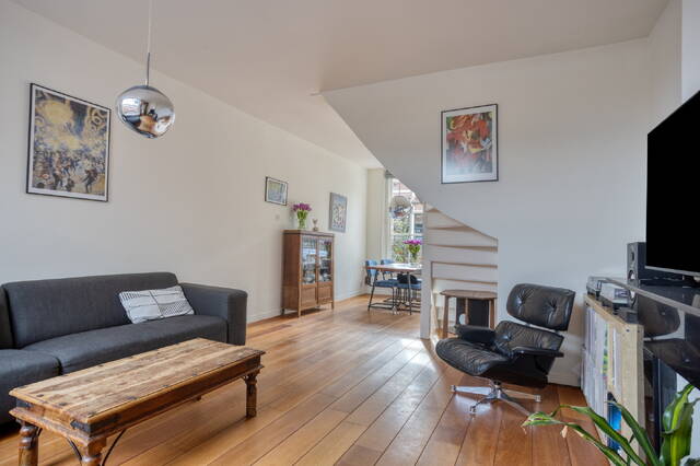 De royale woonkamer vormt een bijzonder prettige en lichte leefruimte, mede dankzij de hoge plafonds en de grote raampartijen die zorgen voor een mooie, natuurlijke lichtinval gedurende de dag. Hierdoor voelt de ruimte open en ruimtelijk aan. De warme robiniahouten vloer en de fraaie schouw benadrukken het karakter van de woning en geven de woonkamer een sfeervolle, authentieke uitstraling.