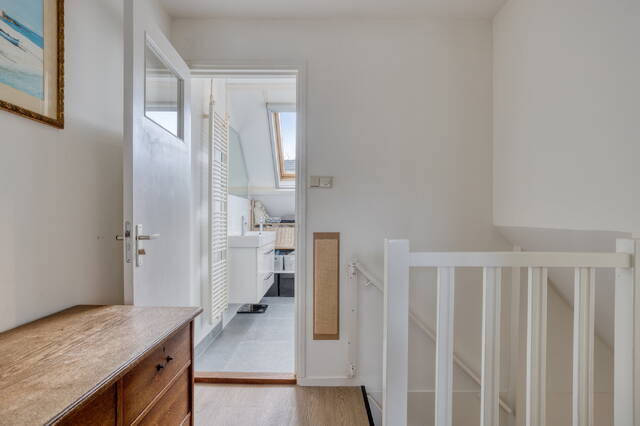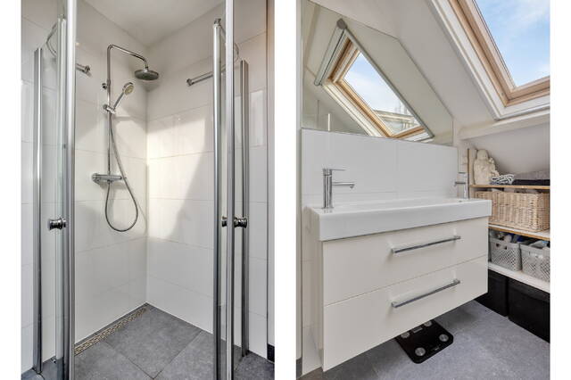 Aan de voorzijde van de woning liggen de tweede slaapkamer en de nette, volledig ingerichte badkamer. De badkamer beschikt over een separate douche, een dubbele wastafel, een tweede toilet (sanibroyeur) en aansluitingen voor de wasmachine en droger. De tweede slaapkamer is licht en knus, dankzij een kleine dakkapel en een Velux dakraam die zorgen voor extra daglicht.