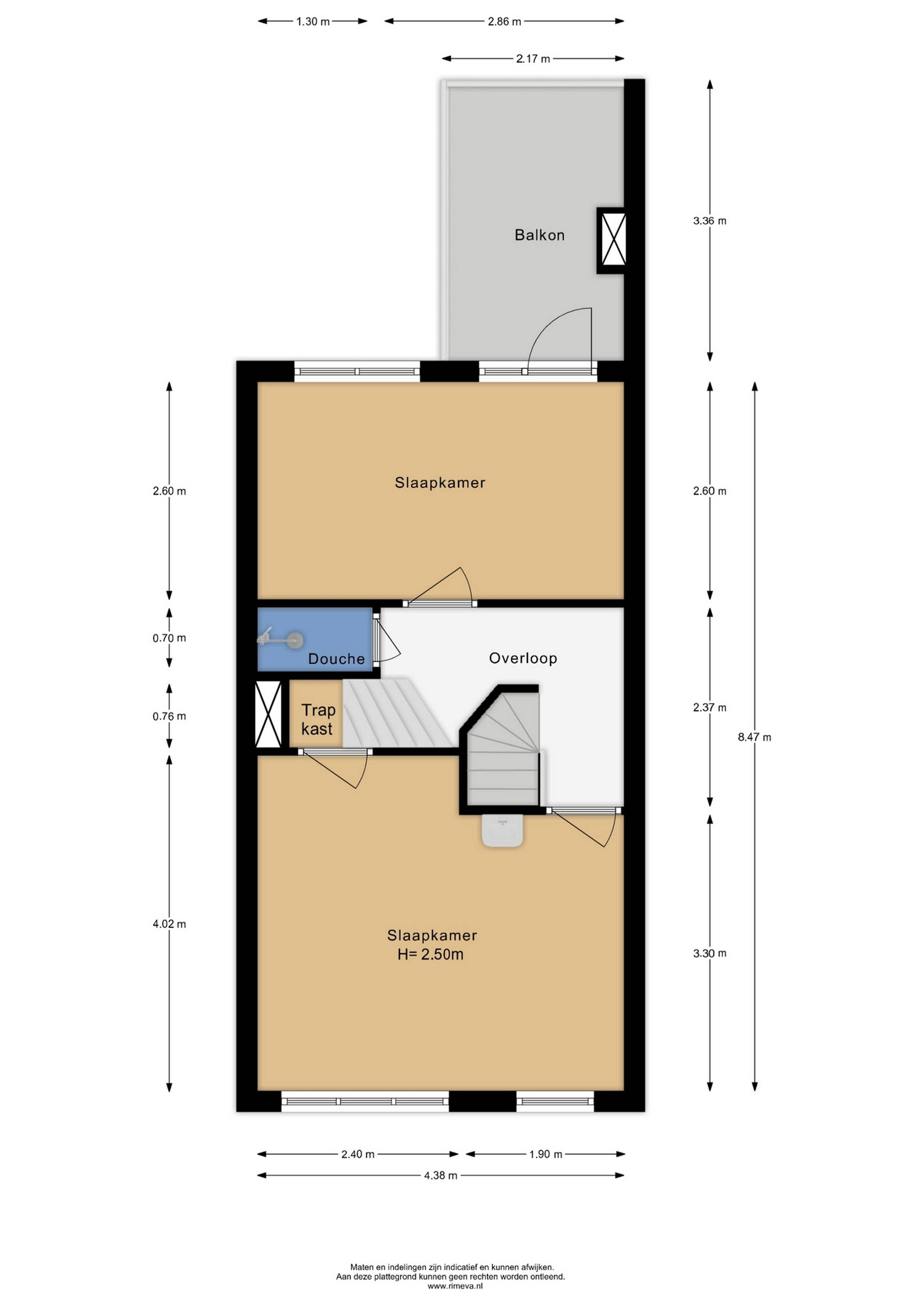 Overloop met trapopgang naar de tweede verdieping. Een ruime slaapkamer aan de voorzijde met wastafelmeubel en deur naar een trapkast. Aansluitend een badkamer met douche. Aan de achterzijde nog een ruime slaapkamer met toegang tot een fijn dakterras (ZW).