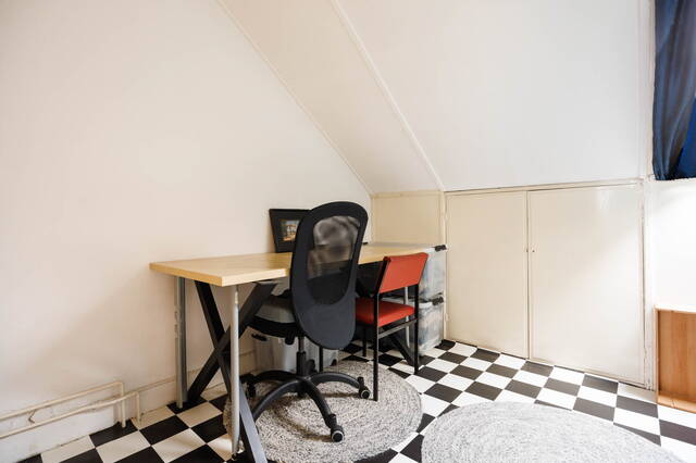 Landing with washing machine setup and central heating boiler, and access to a spacious rear bedroom with a dormer window, built-in (sliding) wardrobe, and ample storage space behind the knee walls. From this bedroom, you can access the front bedroom, which features a skylight, built-in wardrobe, and additional storage behind the knee walls.
