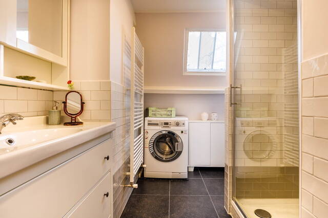 De moderne badkamer is voorzien van een inloopdouche, wastafelmeubel, toilet, handdoekenradiator en een aansluiting voor de wasmachine.