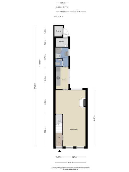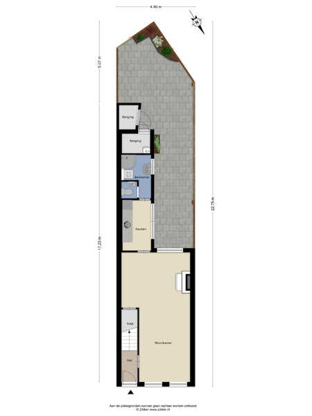 Entree via de hal met trapopgang en bergruimte. Vanuit de hal bereik je de lichte woonkamer aan de voorzijde. Aan de achterzijde bevindt zich de keuken met aansluitend de badkamer en het toilet. Vanuit de keuken heb je toegang tot de diepe achtertuin.