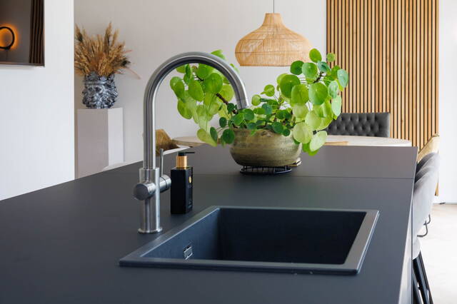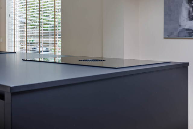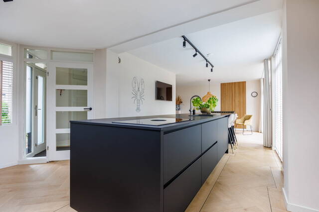 Keuken: de luxe open keuken is het hart van het huis. Uitgevoerd met een groot kookeiland, strakke matzwarte kastenwand met inbouwapparatuur (o.a. oven en combi-oven, een Quooker en een inductiekookplaat met ingebouwde afzuiging), en veel bergruimte. Dankzij de grote ramen en lichtkoepel is het een bijzonder lichte leefruimte.