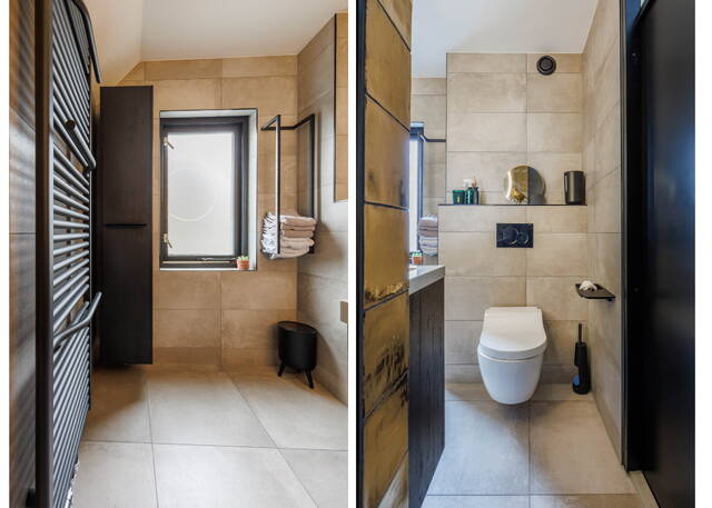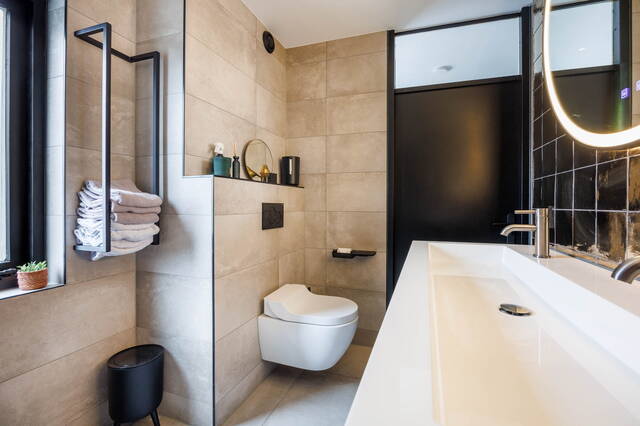 Badkamer: modern afgewerkt met een inloopdouche, wastafelmeubel en tweede toilet.