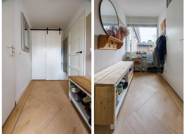 Voortuin & entree: een verzorgd aangelegde voortuin leidt u naar de entree met overkapping. Hier vindt u de ruime hal met garderobe, meterkast, trapkast en een modern toilet met fonteintje.