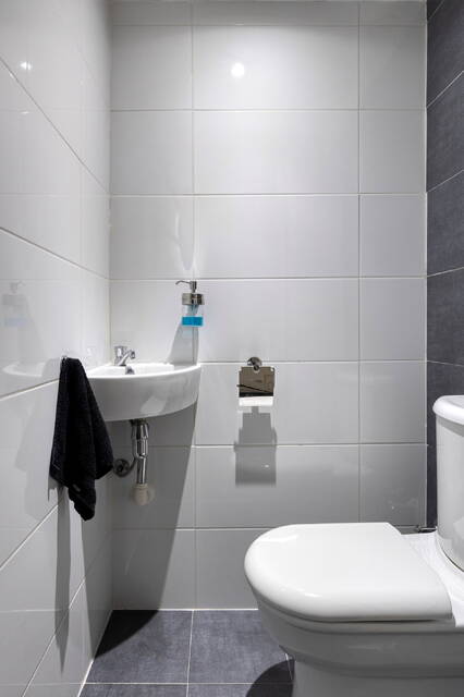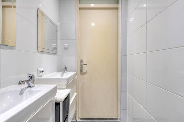 wastafelmeubels en twee spiegels. Daarnaast is er een separaat toilet met fonteintje,