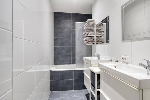 De badkamer is netjes afgewerkt en voorzien van een bad, douche, twee