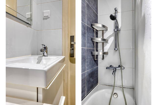 The bathroom is neatly finished and equipped with a bathtub, shower, two washbasin