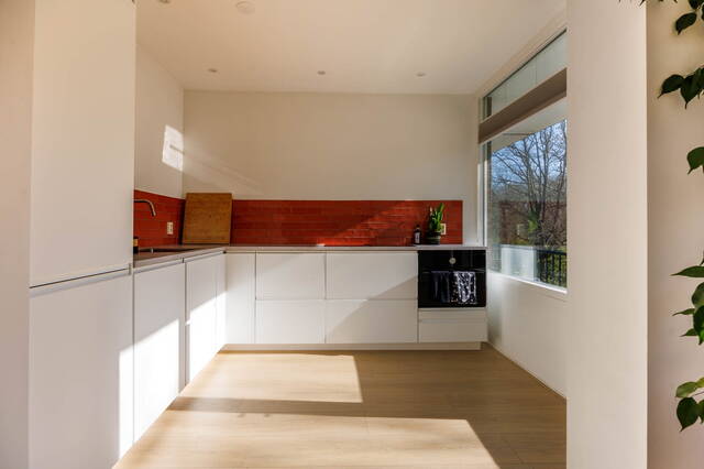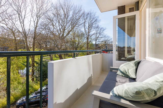 From the kitchen, you can access the sunny east-facing balcony with a lovely view over the park and the water.