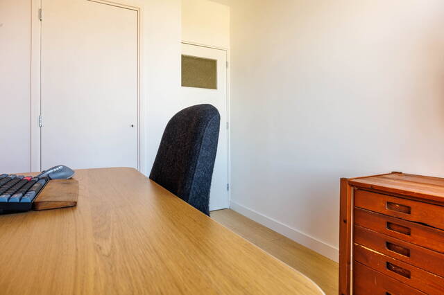 The 3 pleasant and bright (bed)rooms are located at the rear. The largest bedroom also provides access to a new bathroom with a walk-in shower with a stylish glass door and a vanity unit with mirror cabinet. From the middle room, you have access to a cozy west-facing balcony with a built-in cupboard containing the central heating boiler. The right-hand bedroom has a fixed wardrobe for extra storage space.