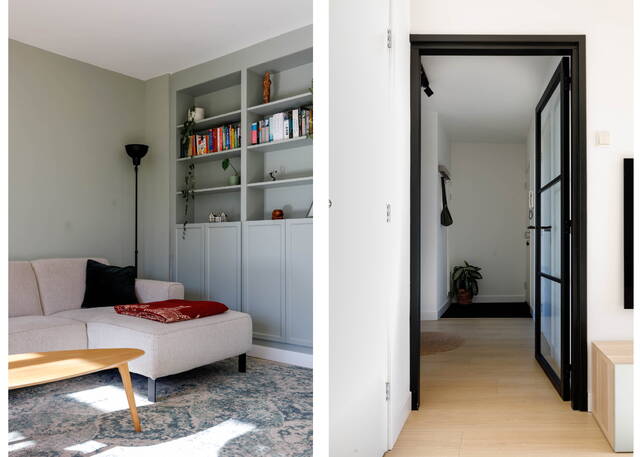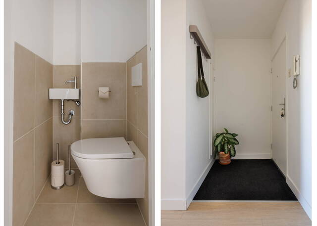 Entrance to the apartment, spacious hallway with a modern toilet with washbasin, meter cupboard, and a large storage space which also houses the washing machine/dryer setup. The sunny and spacious living room with a modern open kitchen features a beautiful custom-made wall unit. The generous kitchen is equipped with various built-in appliances, including an induction hob with integrated extraction, dishwasher, refrigerator, washing machine, and a combi-oven.
