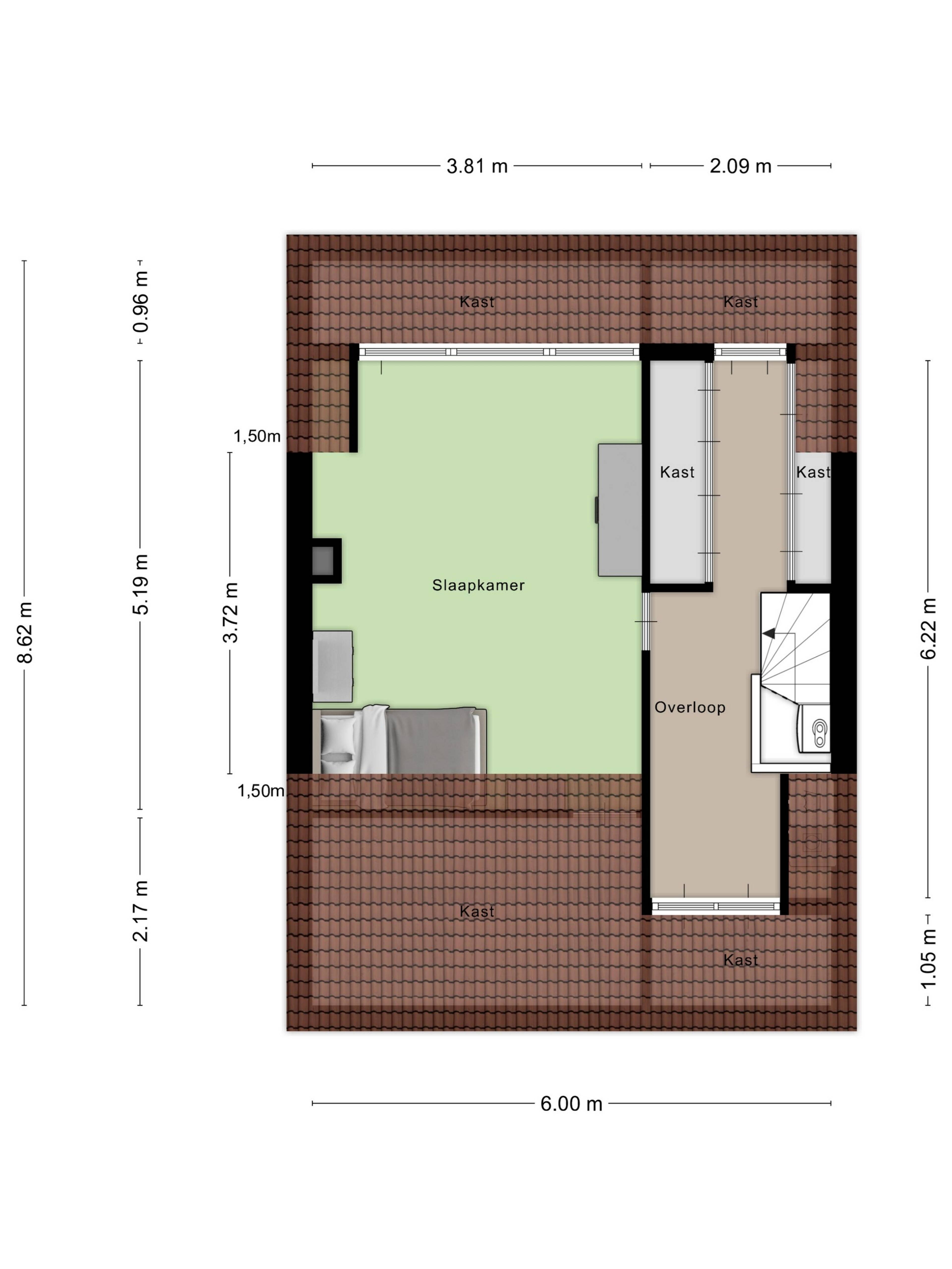 Een vaste trap leidt naar de royale zolderverdieping, met een ruime vierde slaapkamer die dankzij de dakkapel en dakramen veel licht ontvangt. Hier is ook veel bergruimte aanwezig achter de knieschotten.