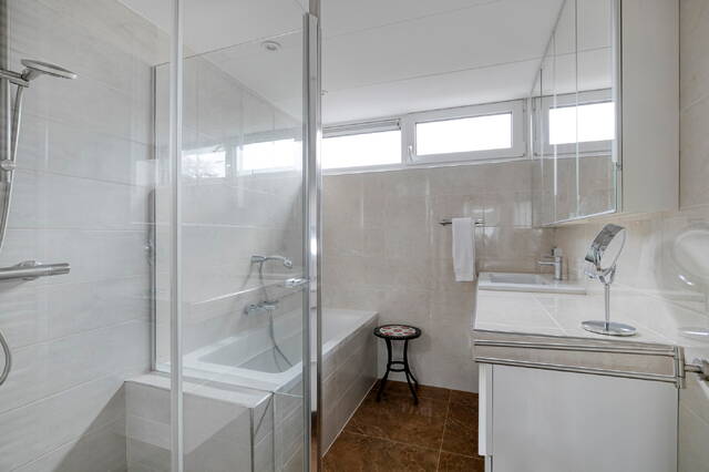 The large north-facing rear garden oeers both sunny and shaded areas and is neatly landscaped with greenery and terraces. At the back of the garden is a stone shed with electricity, ideal for bicycles, tools or hobbies. The front garden is also well maintained, giving the property a welcoming appearance.