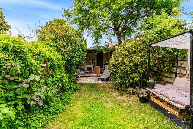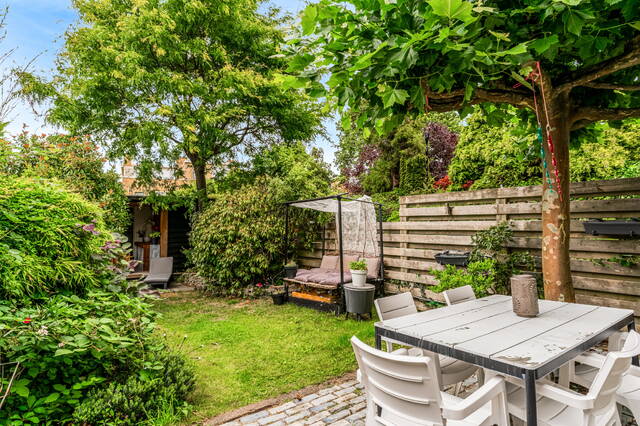 Through French doors or the kitchen door you reach the deep, northwest-facing backyard, approximately 14 meters deep, with a cozy canopy/veranda and storage room. A wonderful place to enjoy the outdoors all year round. From the roof there is also access to the separately offered garage.