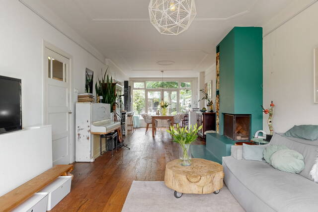 Through the spacious and sunny front garden you reach the vestibule with wardrobe, meter cupboard and characteristic stained glass windows. The hall gives access to the modern toilet, a practical stair cupboard and the spacious living room with open kitchen. The extended living room of approximately 40 m² is light and attractive, with a bay window, sleek plastered walls and ceilings with subtle mouldings, a beautiful wooden floor and a fireplace. The open kitchen with beautiful cooking island forms the heart of the house and is directly connected to the dining area. The kitchen is fully equipped with, among other things, a 6-burner gas stove with large oven, stainless steel extractor hood, dishwasher, refrigerator, Quooker and combination microwave.
