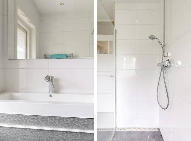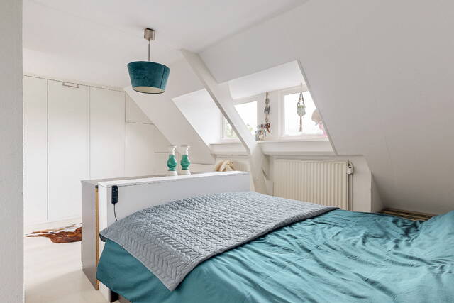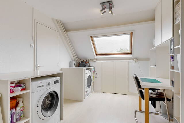 The staircase leads to a spacious landing with skylight, laundry room and a practical workplace with fixed cupboard wall. Here is also a spacious bedroom with dormer window and plenty of storage space. The second modern bathroom has daylight and is equipped with a third toilet, a spacious double bath, a walk-in shower, washbasin with mirror cabinet and design radiator. The spacious attic is accessible via a loft ladder.