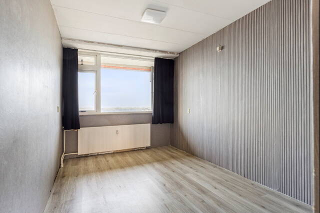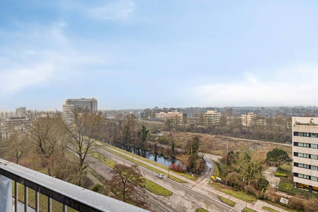 Het balkon strekt zich over de achterzijde van de woning en is toegankelijk vanuit de woonkamer, waardoor u heerlijk kunt genieten van de zon, het uitzicht en de frisse lucht. Door de ligging op de 10e etage ervaart u een gevoel van ruimte en vrijheid, met een schitterend panorama over de stad en het omliggende groen.