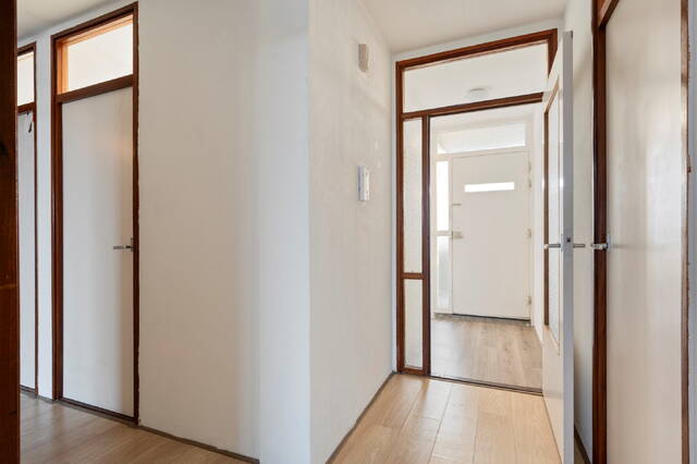 De woonkamer is royaal van opzet en dankzij de grote ramen bijzonder licht, met een prachtig uitzicht over het park en de omgeving. Vanuit de hal bereikt u tevens de keuken, die praktisch en efficiënt is ingericht, de drie slaapkamers, de fijne badkamer en het separaat toilet. Ook de bergingsruimte binnen de woning is vanuit de hal toegankelijk, wat extra gemak en opbergruimte biedt.