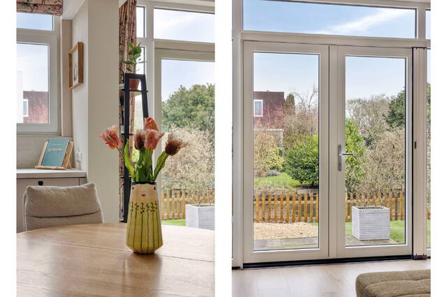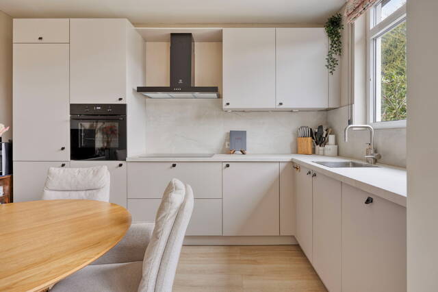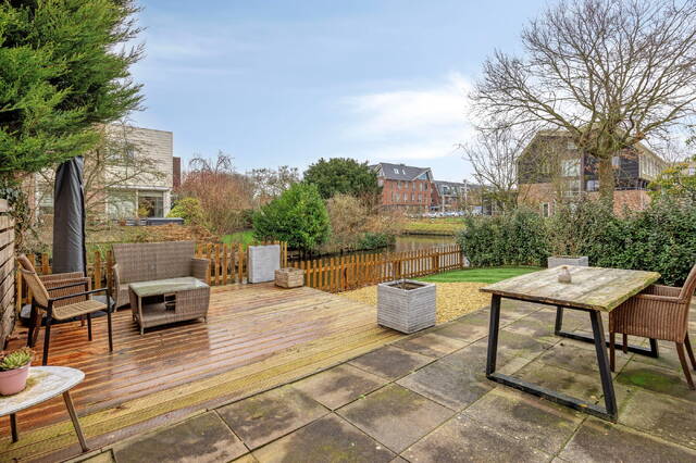 Aan de achterzijde van de woning ligt de lichte, tuingerichte woonkamer met laminaatvloer en openslaande deuren naar de zonnige achtertuin aan het water. De open keuken is uitgerust met moderne apparatuur, zoals een inductiekookplaat, afzuigkap, koel-/vriescombinatie en vaatwasser. Door de vele ramen is er volop natuurlijk licht, waardoor een prettige ruimte ontstaat voor zowel een gezellige zithoek als een ruime eettafel.
